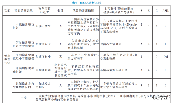 运转场景和摧残的合系组合可确定摧残事宜,并对每一个摧残事宜界说为E(宣泄概率)、C(可控性)、S(急急度)三个参数,以及对应的ASIL品级,HARA阐述示例睹表4。以表4中“非预期输出驱动扭矩”导致的摧残事宜为例:因为正在较高车速发作弯道碰撞,常常会爆发万分急急或致命侵害,急急度为S3。大无数驾驶员均匀每天都邑碰着此驾驶场景,其正在均匀驾驶年光中的占比大于10%,宣泄概率为E4。因为大于90%的驾驶员可通过制动或转向限制车辆避免发作碰撞,可控性为C2。遵循S、E、C三个参数的组合,该摧残事宜的汽车安适完备性品级为ASILC。