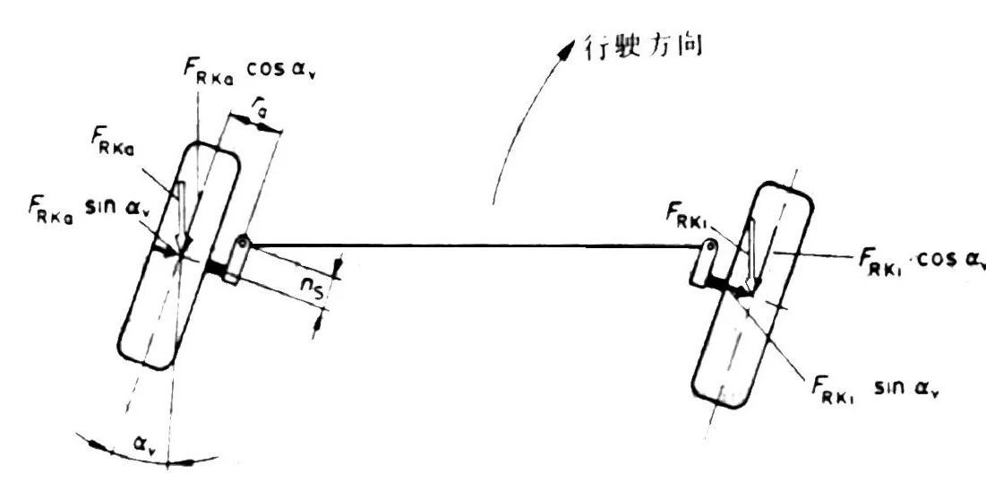 图3.99 转弯时因为轮胎的侧偏角使滚动阻力FRka和FRki增大,将其沿侧偏角αv偏向判辨。分力FRK·cosαv功用正在车轮核心,并有力臂ra。αv愈大,主销后倾拖距nk愈大,则因FRK·sinαv惹起的转向回正力矩也愈大。为了简明起睹,正在此不探究轮胎拖距nk。