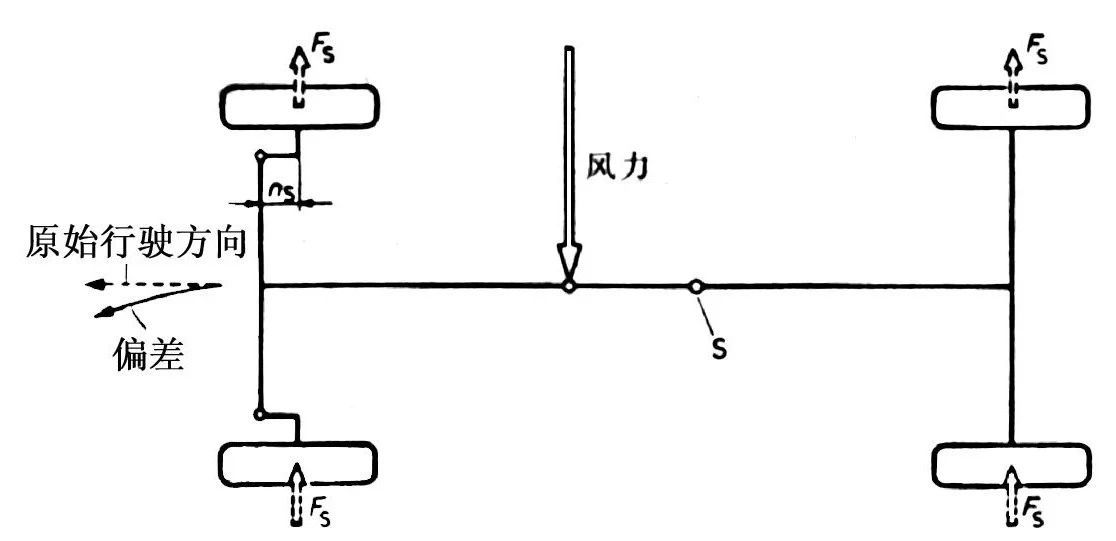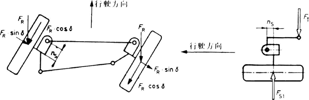 若是道面不服度或转向运动使车轮自直线行驶偏向转过一个角度δ,则滚动阻力分为FR•sinδ通过力臂ns(或nsg)使车循环转,直至返回直线行驶场所。驾驭闪现的分力FR•cosδ彼此抵消,它们仅使转向横拉杆受压。车轮采用主销前倾,则会发生相反的恶果:汽车变得不稳固。主销后倾正在直线行驶时并不但有甜头,也有偏差。道面不服度正在车轮接位置上惹起交变的侧向力,通过力臂ns(或nsg)发生绕转向节轴的力矩(图3.95),力矩功用正在转向横拉杆上并会惹起转向冲锋及转向不稳固。另外,功用正在车身上的风力惹起车轮接位置上闪现反向功用的侧向力Fs,前轮上的力Fsv通事后倾力臂ns(或nsg)发生力矩,这些力矩使汽车按风功用偏向转向,即附加正在车身被风压转的偏向上的。因为这些来历而使汽车的侧风敏锐性升高。