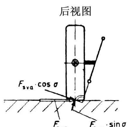 图3.97 将正在前轮接位置闪现的侧向力沿转向节轴及其垂线偏向判辨, 图示为转弯时车身外侧车轮,则力Fsva·cosб发生回正作 用,而力Fsva·sinб使笔直力Fnva增大。