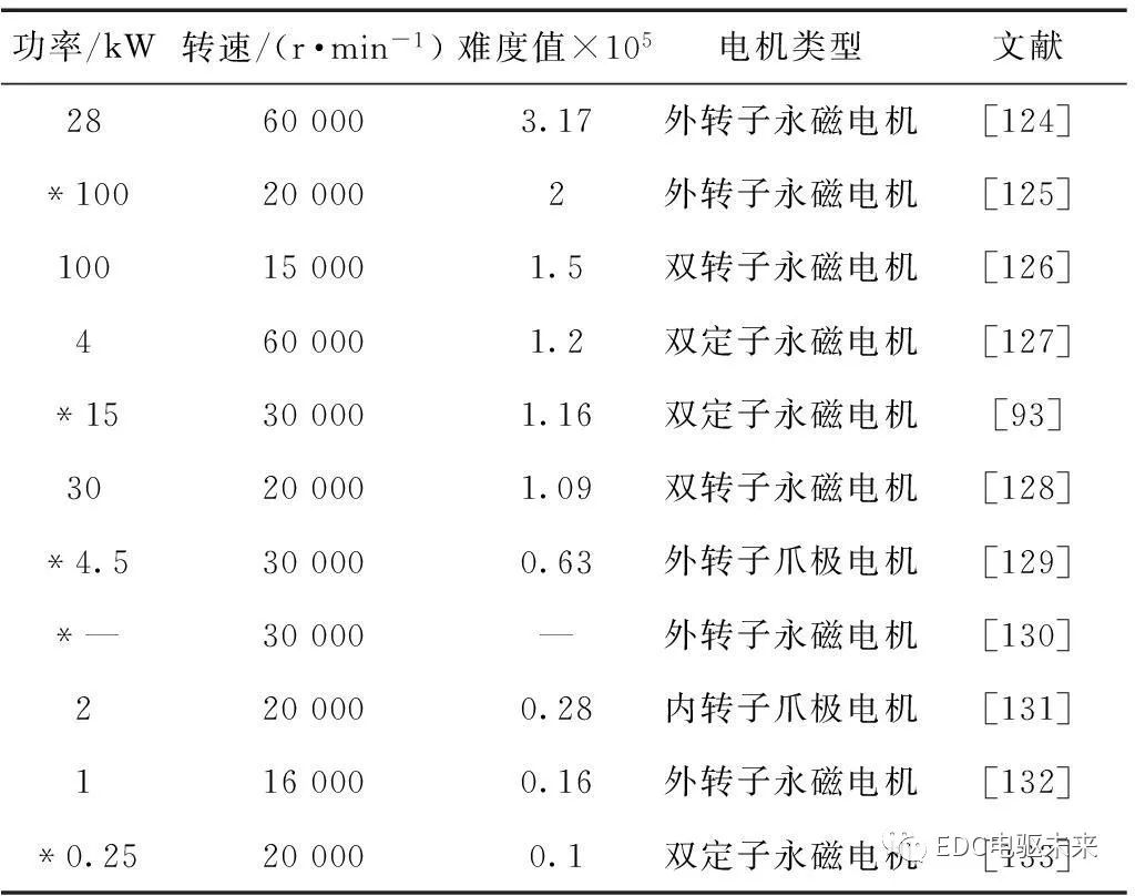 高速电机除上述3品种型的电机外,另有少数外转子永磁电机与爪极电机。本文对国表里其他类型的高速电机举行的不齐备统计如表4所示。外转子高速永磁电机最高难度值为3.17×105(28 kW、60 000 r/min),最大功率为100 kW,最高转速为60 000 r/min。哈尔滨工业大学、山东大学、浙江大学针对外转子高速永磁电机发展了闭联的探求劳动,沈阳工业大学对双定子单转子轴向磁通电机和外转子爪极高速电机举行了肯定探求。