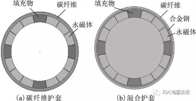 文献[141]对一台1 120 kW、18 000 r/min的高速永磁电机安排了两种扞卫方法:一种采用纯碳纤维扞卫方法,一种采用合金钢和碳纤维联合构成的夹杂扞卫方法,如图10所示。此中纯碳纤维扞卫套与永磁体采用过盈配合,夹杂扞卫方法与永磁体采用间隙配合,间隙处填充高强度粘合剂,夹杂扞卫方法可低重纯碳纤维扞卫套的弯曲应力。实践证实采用上述扞卫方法的两种转子样机均能正在22 000 r/min安静运转。