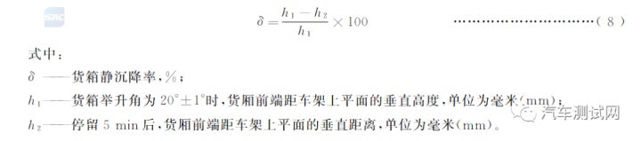 三轮汽车空载挂最低挡,以不乱低速行驶,转向盘(或转向把)向一方转到极限名望,同时正在地面上标出前轮对称中央面与地面接触点,驶完一整圈畏缩出试验地方,用卷尺正在均布三个宗旨上衡量轨迹圆的直径,取均匀值。衡量应永别正在向左和向右两个宗旨前进行,各测两次,取均匀值。以向左或向右转的大值为该车的最小转向圆直径。各使用机构使用力的衡量,均是用分歧型式的测力计举办的。衡量时,被试三轮汽车处于静止状况,永别衡量将各使用机构平缓地移至其做事名望时所需的最小使用力,出力点为驾驶员老例使用名望的中点。开始正在试验地方上画出如图1所示的行驶道途km/h的速率自A点起源, 使其前轮沿弧线ABCD行驶, 衡量被试三轮汽车自B点到C点行驶时间效用正在转向盘上的最大使用力。衡量应永别正在向右转和向左转两种情景下各举办三次,永别取其均匀值。向左转时,应沿一条与图1中X轴对称的道途 正在试验道途中段划出长20m、宽2.5m的直线区段为测区,测区两头有符合长的隔断使被试三轮汽车正在抵达测区前能抵达规矩车速。9.1.2 被试三轮汽车的制动胀处于冷态(100℃以下),被试三轮汽车以20km/h的不乱车速沿测区中线直线行驶抵达测区后,缓慢踩下聚散器踏板和制动踏板要紧制动至完整泊车,随后将变速杆挂空挡。测定并记实制动初速率和制动隔断,同时测定制动踏板力。试验应往返各举办两次,取均匀值。制动试验历程中不应转动转向盘(或转向把)。阅览被试三轮汽车的任何部位是否超过试车道宽度。9.2 驻车制动本能被试三轮汽车空载开上坡度为20%的平整、洁净、干燥的水泥或沥青途面制动泊车:预先将测力安装套正在驻车使用手柄上测定制动使用力,将驻车使用手柄扳到最大做事名望,随后挂空挡,松开脚制动,带动机熄火, 正在后轮胎最大外径及与地面接触点处永别划出泊车记号线min后衡量后轮胎外径转动角位移及与地面的相对位移,然后被试三轮汽车调头180°,反复上述试验。9.3 行车制动与驻车制动的台尝尝验睹GB 18320的规矩。10 燃料消磨量试验采用柴油机的三轮汽车燃料消磨量睹GB 21377的规矩。电动三轮汽车的能量消磨率和续驶里程依照GB/T 18386的规矩举办。11 境况污染测定11.1 加快行驶车外噪声的测定睹GB 19757的规矩。11.2 驾驶员操作名望处噪声的测定按GB/T 19118的规矩举办。11.3 自正在加快烟度的测定睹GB 18322的规矩。11.4 排气污染物排放睹GB 19756的规矩。12 自卸货箱本能试验12.1 试验条款试验应正在无显着坡度(纵向和横向)的坚实地方前进行。12.2 仪器兴办角度计、转速表、秒表、直尺等。12.3 试验设施12.3.1 举升岁月和最大力升角测定三轮汽车空载状况下将车厢栏板锁定使其不会开启,带动机正在额定转速下运转,测定从举升操作起源至车厢举升到最台甫望所需的岁月,随后,正在支配两侧衡量车厢举升到最高名望时的举升角。试验反复举办两次,取其均匀值。12.3.2 货箱静浸降试验被试三轮汽车装载110%的额定载荷,载荷匀称分散并固定正在车厢内,当车厢举升角达20°±1°时,将举升使用手柄置于中立名望, 带动机熄火。衡量车厢停止5min时车厢前端的笔直低落量。12.4 试验结果及陈述对12.3.2试验,货箱静浸降率按式(8)阴谋: