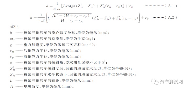 附 录 A(样板性)三轮汽车质心高度测定法本附录给出了三轮汽车测定质心高度坐标h的设施。衡量时,开始应正在水准状况下,将被试三轮汽车的悬架弹簧与车架间的间隙,用木块塞紧,使弹簧不复兴效用。然后,将被试三轮汽车的前轮垫起(睹图A.1)。使被试三轮汽车起码倾斜15(即α≥15°),测记此时的后轮撑持反力(制动器处于非做事状况)及图中所示的参数,用式(A.1)或式(A.2)即可算得质心高度坐标h值: