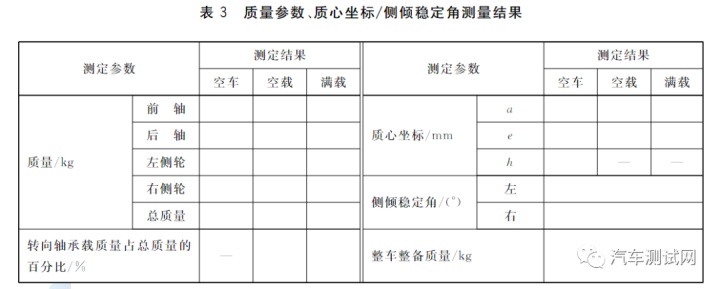 5.2.2 质地参数永别正在空载(有一名驾驶员、无载货和其他乘员)状况和满载(有一概乘员和最大厂定装载质地,下同)状况下测定被试三轮汽车的总质地及前、后轴上的质地分拨,睹表3。5.2.3 质心坐标三轮汽车的质心坐标用a、e、h示意。a为质心的纵向坐标,即质心距后轮轴的水准隔断;e为质心的横向坐标,即质心到三轮汽车的纵向中央平面的隔断,顺挺进宗旨看,质心正在该平面左侧时,正在e值前面注以“一”号,反之不注。a和e是由4.2.2衡量结果按式(1)和式(2)阴谋而得。h为质心的高度坐标,即质心至车轮的刚性支安宁面的隔断。它是按附录A先容的力矩平均法及其阴谋公式衡量阴谋而得。测试正在与测定整备质地雷同的条款下举办。5.2.4 测定结果及陈述按式(l)、式(2)永别阴谋质心的纵向坐标、横向坐标,质心高度坐标h的阴谋公式,随测试设施而异(睹附录A),结果记入表3。