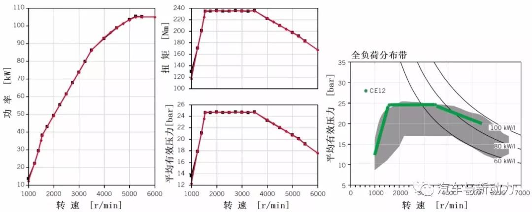 CE12发起机装备了带有电控废气放气阀奉行器的涡轮增压器,这种策画使发起机抵达了220 N·m/1 400 r/min 和235 N·m/1 550 r/min的低速扭矩以及105 kW/5 250 r/min的全负荷功率(图7)。最高涡轮转速抵达210 000 r/min,从而确保了精良的海拔高度储藏。这种涡轮增压器采用准绳资料,能正在高达950 ℃的最高废气温度下告终耐久运转。