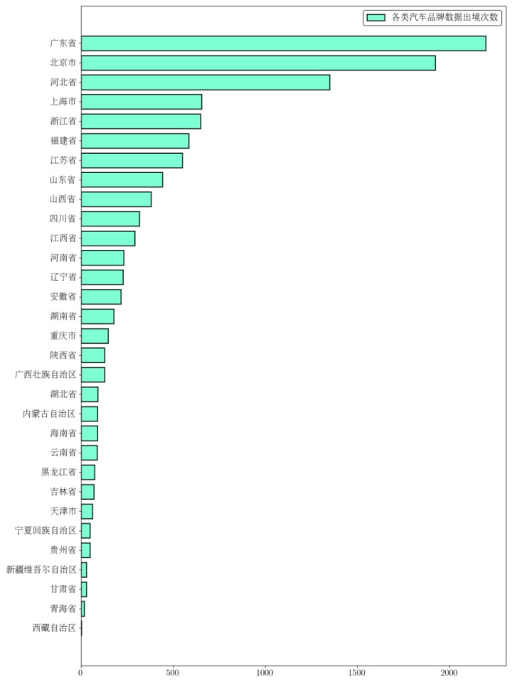 从车辆数据的出境景况来看,了解光阴境内31个省级行政区均存正在车辆数据出境行动,出境次数漫衍景况如图 3所示,此中福筑省、北京市、天津市、浙江省、广东省、上海市等六地出境汽车数据的次数占总出境次数的95%。