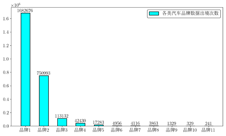存正在汽车数据出境行动的汽车品牌11个,占所了解品牌的73.3%。此中排名第一的品牌出境次数达1,682,676次,整体景况如图 2所示,合座来看,汽车数据出境是涉及众类汽车品牌的一般行动。
