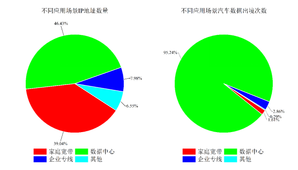 境内IP地点的使用场景如图 5所示(图中“其他”搜罗学校单元、搬动收集、机合机构、CDN等场景),出境场景以三种局势为主,分袂是数据中央、家庭宽带和企业专用,其余场景的IP地点数目和数据出境次数均较小。此中,数据中央场景下的IP地点数目和出境次数均最众,分袂达5,319个和2,496,467次;家庭宽带场景下的IP地点有4,472个,彰彰众于企业专用的914个,但其每个IP地点的均匀数据出境次数仅为9.5次,彰彰少于企业专用的82次。