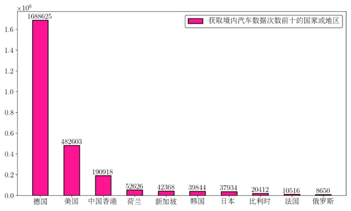 从境外汲取境内车辆数据景况来看,了解光阴境外共有146个国家或地域获取境内车辆数据。获取境内数据次数前十的国家或地域景况如图 6所示,此中德国获取境内汽车数据次数最众,占总次数的64.4%。