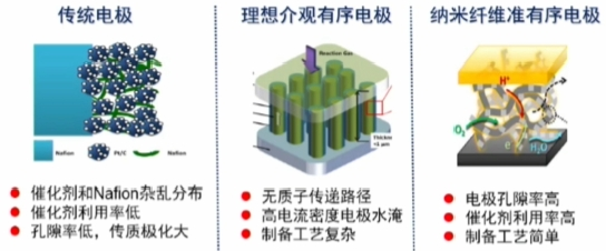 催化剂、膜、扩散层构成膜电极(MEA),存正在的题目是催化剂使用率低;催化层机合无序;界面通报阻力大。繁荣宗旨是消重Pt用量;省略欧姆、传质极化;抬高大电流职能。
