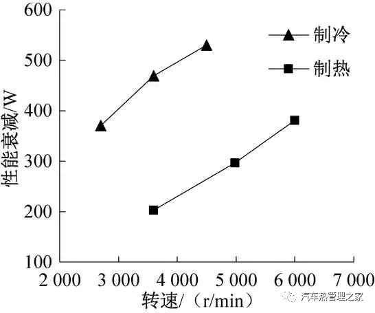 图6 (-25 ℃, 20 ℃)工况下体系制热本能Fig.6 Heating performance of the system under (-25 ℃, 20 ℃) conditions带水环道的体系形势,不妨巩固体系的安然牢靠性,但与通例热泵体系比拟,通过载冷剂(即水)与制冷剂的换热,增进了体系的换热失掉。此时,通过比照制冷剂侧与水侧的制冷/制热量,得到体系本能的衰减处境。本文剖判了车内温度27 ℃,境遇温度45 ℃的制冷工况及车内温度20 ℃,境遇温度-20 ℃的制热工况下,体系本能的衰减处境,本能衰减量为公式(3)与公式(4)换热量之差,结果如图7所示。经剖判可知,与通例体系比拟,带水环道的体系制冷量衰减300~500 W,制热量衰减200~400 W。