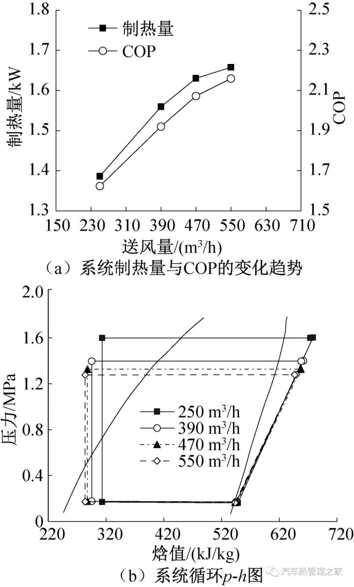 图5 (-20 ℃, 20 ℃)工况下体系制热本能Fig.5 Heating performance of the system under(-20 ℃, 20 ℃) conditions跟着电子膨胀阀开度的增进,体系COP与制热量,均映现先上升后消浸的趋向。统一工况下,最优COP对应的膨胀阀开度为最佳阀开度,此时体系制热量到达最大。这解说合意的膨胀阀开度,有助于擢升热泵体系本能;别的,跟着压缩机转速的擢升,最佳开度逐步增大。正在最佳阀开度的要求下,跟着压缩机转速的增进,体系制热量亲切线性增进,而体系COP接续消浸。能够看出:转速正在6 000 r/min,体系制热量为2 911 W,COP为1.80。与6 000 r/min比拟,转速正在3 600 r/min时体系制热量下降约32.5%,而COP普及约27.6%。别的,压缩机转速从5 000 r/min增至6 000 r/min,体系输入功增进了367 W,而供暖才智增进了415 W,是输入功增量的1.13倍,采暖效力仍优于高压PTC电压热。图5(c)和(d)为最佳阀开度时,等熵压缩效力η及换热器对数均匀温差的蜕化趋向。图5(c)可知,跟着压缩机转速的增进,等熵压缩效力呈线 r/min时,等熵压缩效力消浸到0.78。图5(d)可知,板式换热器的对数均匀温差为9.7~14.0 ℃,车内换热器的对数均匀温差为7.2~10.6 ℃,车外换热器的对数均匀换热温差为2.8~3.6 ℃,随压缩机转速的增进呈上升趋向,这首要受制冷剂流量和排气温度的影响。正在压降方面,板换制冷剂侧压降为1~2 kPa,车外换热器压降为13~25 kPa,随转速的擢升而增大,这首要受制冷剂流量和工质黏度的影响。体系运转中,换热器的传热温差、压降及其震荡幅度均不大,呈现了R290工质优越的传热及滚动特征。这也是R290热泵体系具有优越地低温制热本能的出处之一。本文进一步测试了境遇温度-25 ℃、压缩机转速3 600 r/min的极低温工况下,体系的制热本能。图6(a)为车室送风风量对体系制热本能的影响,增大送风风量,体系制热量和COP随之增进。送风量为550 m3/h时,体系制热量和COP区别为1 658 W和2.16。别的,送风量从250 m3/h增至390 m3/h时,制热量和COP区别擢升约12.5%和18.2%;送风量从390 m3/h增至550 m3/h时,制热量和COP区别擢升约6.3%和12.5%。从中能够看出:跟着送风量的擢升,制热量和COP的增进幅度逐步减小。图6(b)为该实践工况对应的体系轮回p-h图。p-h图是按照实测数据绘制的,正在绘制p-h图时,假设膨胀经过是等焓膨胀经过。跟着车内风量的增进,蒸发压力根基维系稳固,冷凝压力大幅度下降,体系COP获得擢升。随风量的增进,冷凝压力的降幅逐步变小,导致体系COP呈非线性增进趋向,增幅逐步减小。于是,增进风量对体系本能改良水平是有限的。