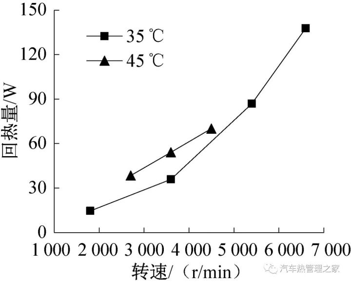 基于上述实践台举办了电动汽车空调体系的制冷本能和制热本能的实践考虑。开始,举办了体系制冷剂的最佳充注量实践。R290充注量的肇端点设为130 g,随后以100 g、70 g、50 g、30 g 或20 g的增量向体系充入制冷剂,直至得到最大的体系COP。最终,该体系的最佳制冷剂的充注量为500 g。完全实践结果均基于最佳充注量。图3为境遇温度及压缩机转速对R290热泵体系制冷本能的影响,设定车内温度为27 ℃。跟着压缩机转速的增进,体系制冷量和排气温度接续上升,而体系COP逐步削减。境遇温度35 ℃、压缩机转速从1 800 r/min 增进到6 600 r/min时,制冷量从1 789 W上升到4 027 W,排气温度从68.0 ℃上升到101.3 ℃,而COP从3.65消浸到1.82。境遇温度45 ℃、转速从2 700 r/min 增进到4 500 r/min时,制冷量从1 973 W上升到3 031 W,排气温度从93.1 ℃上升到105.7 ℃,而COP从2.10消浸到1.88。压缩机转速3 600 r/min的要求下,与35 ℃工况比拟,45 ℃工况的制冷量削减11.4%掌握、COP消浸26.2%掌握、排气温度上升20.9%掌握。由图4可知,与无回热器的体系比拟,带回热器的体系制冷量较大,设定制冷量的增幅为回热量;跟着压缩机转速的擢升或境遇温度的增进,回热量逐步变大。此中境遇温度35 ℃、压缩机转速6 600 r/min时,回热量为138 W;与无回热体系比拟,制冷量增进了约3.54%,体系COP擢升了约3.48%。这阐明回热器的行使,有用地改良了体系的制冷本能,显着地减缓了高转速或高温工况下制冷本能的衰减。