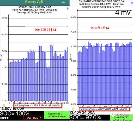 2017年2月2日,正在满充条目下,可用容量为76.4kWh,电芯的电压为4.19V(比拟4.2V略有衰减);2019年6月14日,充电只可充到97%(用时1个小时51分钟),可用电量为64.3kWh,电芯电压为4.07V,低浸了0.12V,低浸了2.86%。