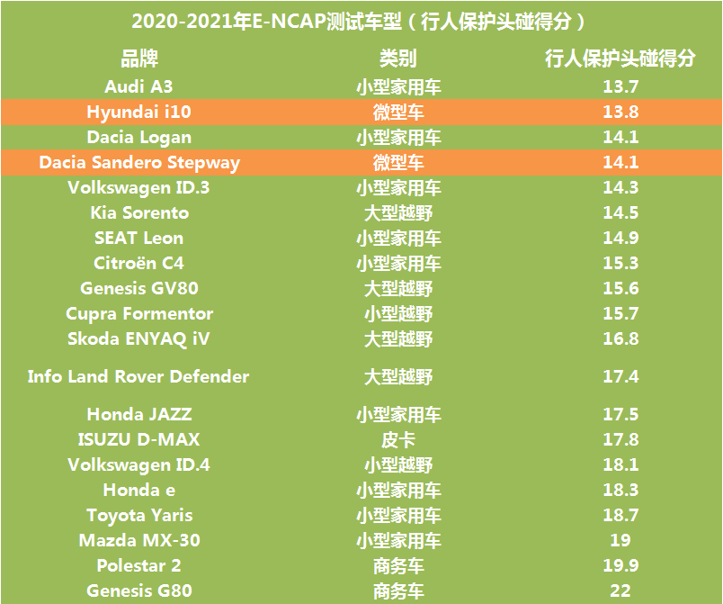 以E-NCAP为例,2020~2021年,微型车行人碰撞维持测试,头碰得分很差。就全体趋向看,车型越小(车头短)、越低矮的车型头部碰撞得分会越低。