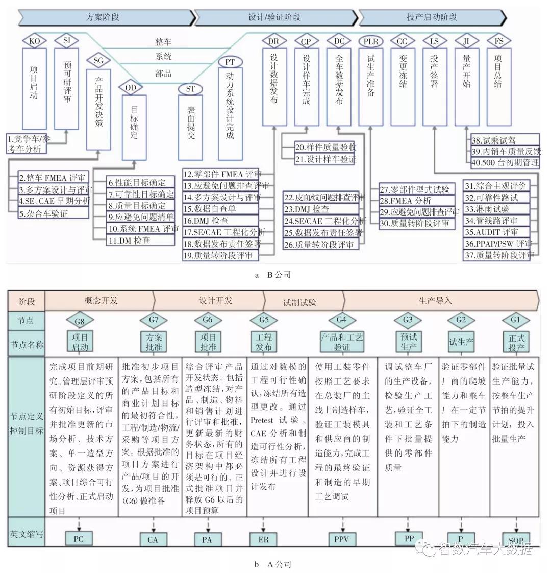 整车拓荒基于PDCA轮回[7]举措,将产物的告竣流程划分为研发、采购、创筑和发售4个紧要阶段。同时构制机构又是各部分职责和分工的根蒂,于是紧要从这5个要素进取行对比,以期能从全面产物告竣的质料局限链上阐明,寻找目前A公司质料管控编制的短板。B公司以质料生意为导向划分各性能部分,分工较细,质料磨练与改进维系实行,针对性强;同时各部学生意的专业性强,正在质料改进中不妨起到主导影响。而A公司紧要采用核心制束缚形式,各核心紧要承当前期生意,后期生意根本都放正在了各分公司的生意部分;供应商质料束缚部分则扶植正在采购核心。目前A公司质料构制机构各部分的生意才具简单、相合性较弱且专业性偏弱,前期和后期生意交代难题,质料束缚部分对供应商的管控才具也对比弱。1)产物研发流程方面。2家公司的产物拓荒流程,如图1所示。B公司产物研发流程以产物先期质料筹办(APQP)[8]为原点,依据“并行、类型、流程化及无缝衔尾”的准则,正在产物研发流程编制中界说了14个项目阶段里程碑,并细化鲜明了40个质料局限点,如图1a所示。而A公司仅界说了8个项目里程碑,束缚不足细化,各阀点交付物之间相合性差,如图1b所示。
