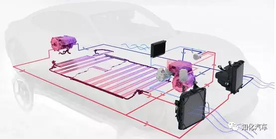 (2)电池包回途:冷凝器-空调压缩机-Chiller-电池包-冷凝器;浅蓝色的为制冷剂回途,正在chiller中与冷却液实行热相易。