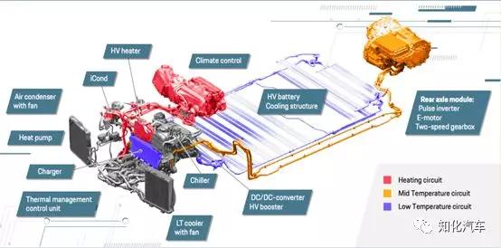 整车的热处置体例构成如下所示,须要实行热处置的部件囊括3类:动力总成(电机电控、减速箱)、功率电器(DCDC、OBC、逆变器)。首要的热处置零部件囊括:1个冷凝器(右)、散热器(左)、3个冷却泵、6个冷却液阀、2个电扇,10个冷却液体温度传感器、1个冷却器Chiller、1个加热器Heater、空调压缩机等。贯注到图中有个Heat pump,解说Taycan有应用热泵身手。