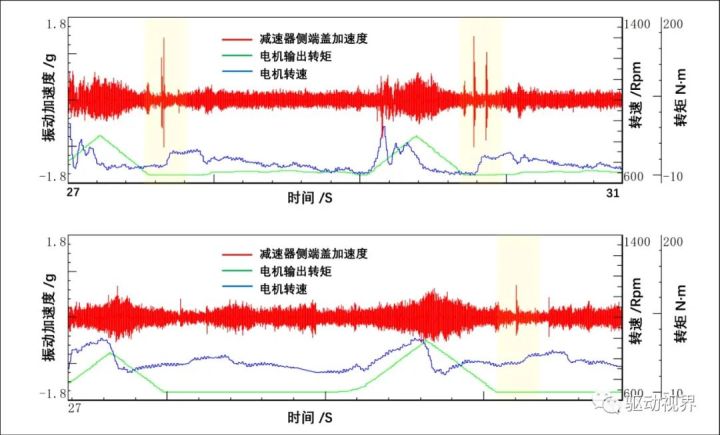 图9 减速器端盖振动的台架测试所以,基于电驱动体例的台架试验,依照减速器的内部构造特质,如图10所示,能够尤其高效地举办异响题目的试验排查理解,闭键排查使命的结论如下:(1)拆除减速箱中心轴,异响隐没;(2)换装减小传动侧隙的一级齿轮副样件之后,如图11所示,主观评议异响也有彰彰地削弱;(3)低浸加载的电机转速动摇,异响彰彰削弱或隐没,如图12所示。所以,依照以上电驱动总成台架的主/客观排查结果,开头推测击异响发作地点能够正在减速器的一级齿轮副左近。