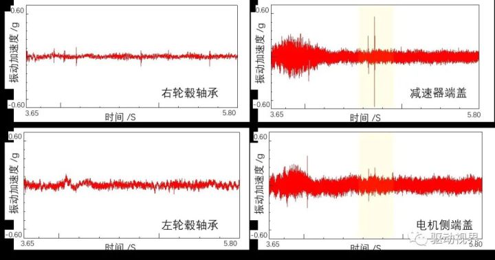图2 近场噪声与电驱振动的时域特质测试理解为了进一步排查此异响地点与潜正在转达途径,永别正在左\右转向节的轮毂轴承、电机侧端盖和减速器侧端盖的地点上,铺排了加快率振动传感器,如图3所示。