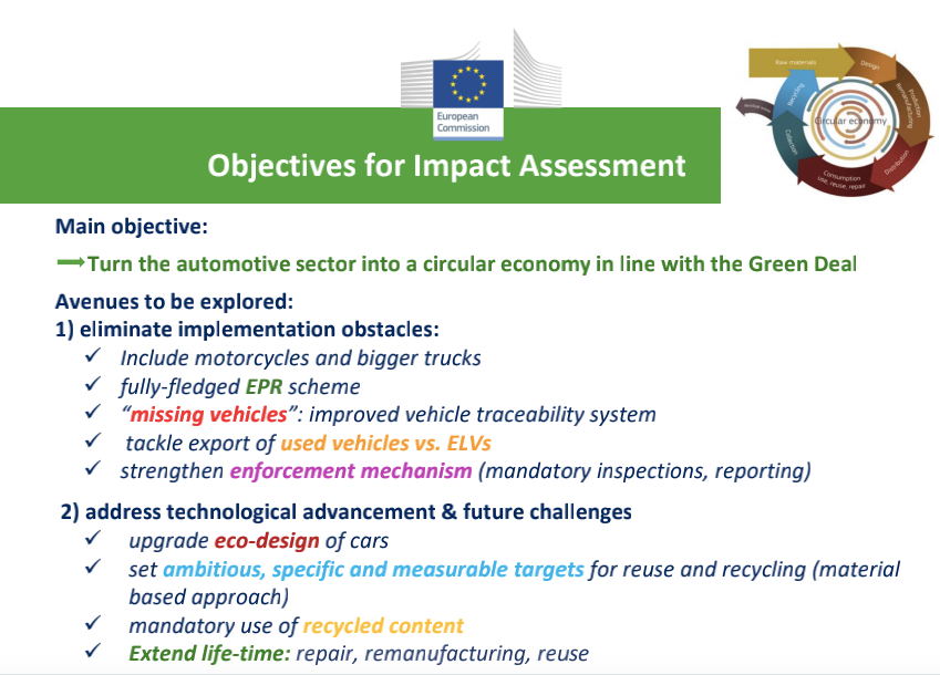 – 通过更新其规则,对 ELV 指令实行有针对性的窜改,以便使它们与欧盟的全体废物立法坚持划一,扩张他们对轮回形式的宏愿汽车行业,并改进指令的奉行。这些规则能够特别要引入再使用的全部宗旨,征求更野心勃勃的接纳宗旨(依照质料); 便当拆解商获取零件和质料音信的程序用于汽车,以督促汽车的再使用、再制作、可拆卸和接纳;