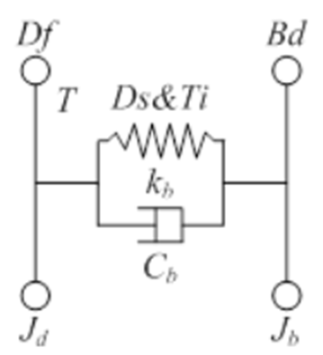 看待1000rpm和1400rpm两个工况而言,前面的六阶频率基础类似,都是由动力总成模态激励出来的共振频率,然后面三个频率是激振力的一阶,二阶和四阶频率,与策划机转速成正比,1000rpm时的一阶频率为16Hz,1400rpm时的一阶频率为22.4Hz,与表中的数据比照,能够看出,这些模态差错基础同等,能够被以为是策划机转速节制进程中的差错变成的。因而,能够以为整车模子筑模餍足动力学模子的央浼2. 动力学筑模-扭振模子简化剖释策划机启停对整车振动的影响,能够从振动源以及通报途径入手,这里将传动体例简化剖释,从通报途径启航来剖释。同化动力传动系能够等效为: