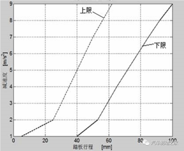 踏板力与减速率联系弧线、踏板行程与减速率联系弧线是透露和评议制动踏板感的有用设施,因而界说这两种联系弧线是研商制动踏板感的根基。图 1、图 2 是目前常用的踏板力、踏板行程与减速率的联系弧线。从图中能够看出,联系弧线会界说一个限度,并法则统一减速率下的踏板力、踏板行程的上限和下限值。制动踏板感的谋划差错、衡量差错以及客户行使的主观性等身分决议了制动踏板感须要界说正在一个限度内。