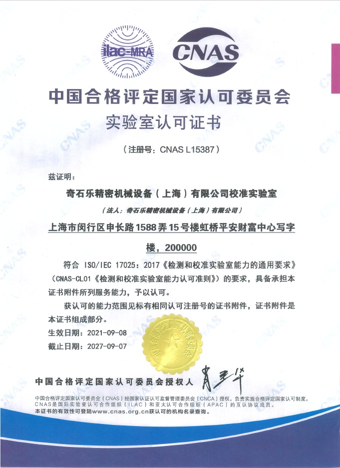 2021年9月8日,奇石乐中国校准实践室由中国及格评定国家认同委员会容许,正式取得CNAS实践室认同证书(注册号CNAS L15387),获胜跻身国家认同实践室队伍。这标