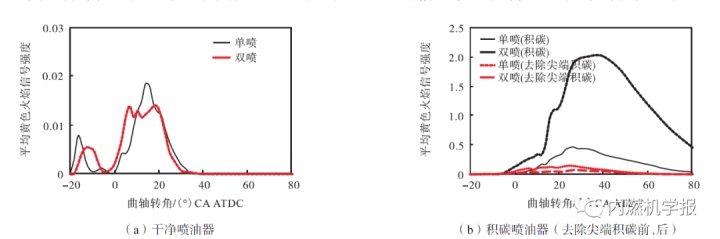 图8为区别喷油次数(单喷和双喷,喷油压力为10 MPa)下的均匀黄色火焰信号强度。因为测试工况均正在进气行程早喷且避免了喷雾撞壁,双喷对清洁喷油器的羼杂气造成质地险些没有刷新,与单喷比拟,缸内燃烧进程中的均匀黄色火焰信号强度没有太大改变(图8a),且峰值都很低。但看待积碳喷油器(图8b),因为存正在光鲜的尖端燃油吸附,且两次喷射比拟于单次喷射填补了一次发生吸附的时机,表面上燃油吸附量也会填补,从而发生更众、更光鲜的黄色火焰,这与图8b中的结果特殊适应。积碳喷油器正在去除尖端积碳前,双喷时的均匀黄色火焰信号强度比拟于单喷光鲜填补。去除尖端积碳后,尖端燃油吸附会光鲜删除(均匀黄色火焰信号强度也光鲜消重,峰值强度删除了约93% ),但已经存正在,这是因为喷孔内部积碳依旧会形成近场喷雾性格的调换,只是尖端金属外观上燃油不易吸附或较易蒸发。于是去除尖端积碳后,双喷依旧会必定水平填补尖端燃油吸附,导致均匀黄色火焰信号强度的略微填补。