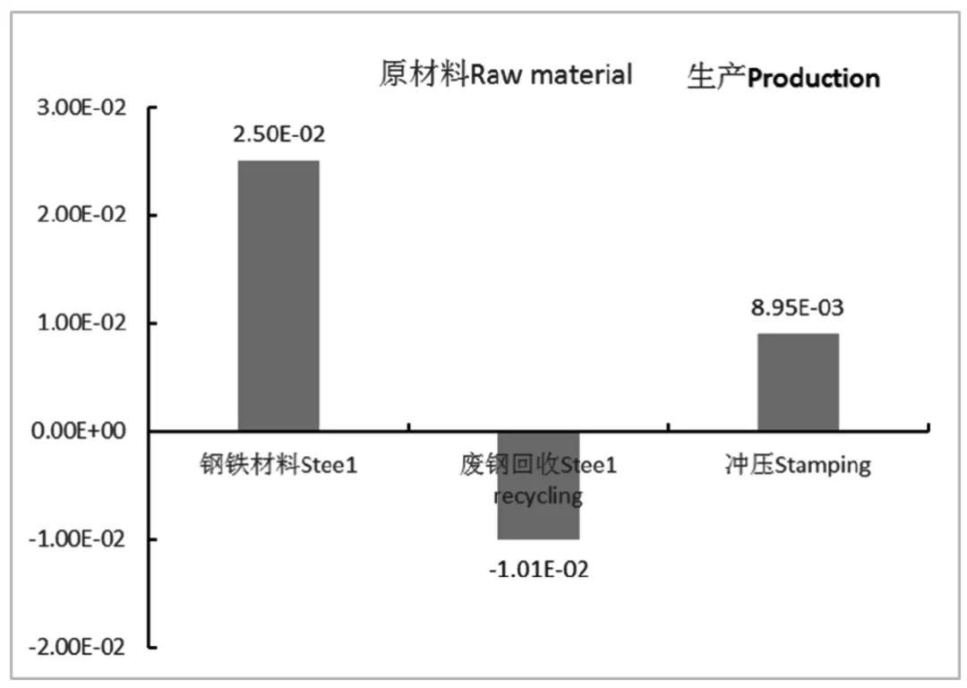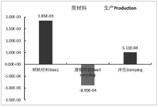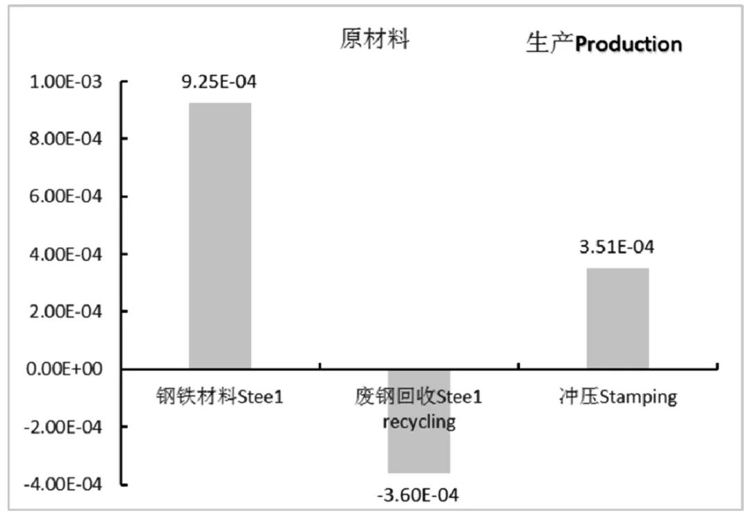 一个左前翼子板性命周期形成的光化学氧化剂天生潜势一共为9.16E—04kgC2H4e,性命周期各阶段的光化学氧化剂天生潜势如图6 所示。由图可知,原质料的获取阶段形成的POCP 最大,为5.65E—04kgC2H4e,进献了总量的61.7%;此中,钢铁质料分娩阶段进献了总量的101.0%;废钢铁质料的接纳欺骗削减了总量的39.3%。左前翼子板分娩阶段POCP为3.51E-04kgC2H4e,占总量的38.3%。