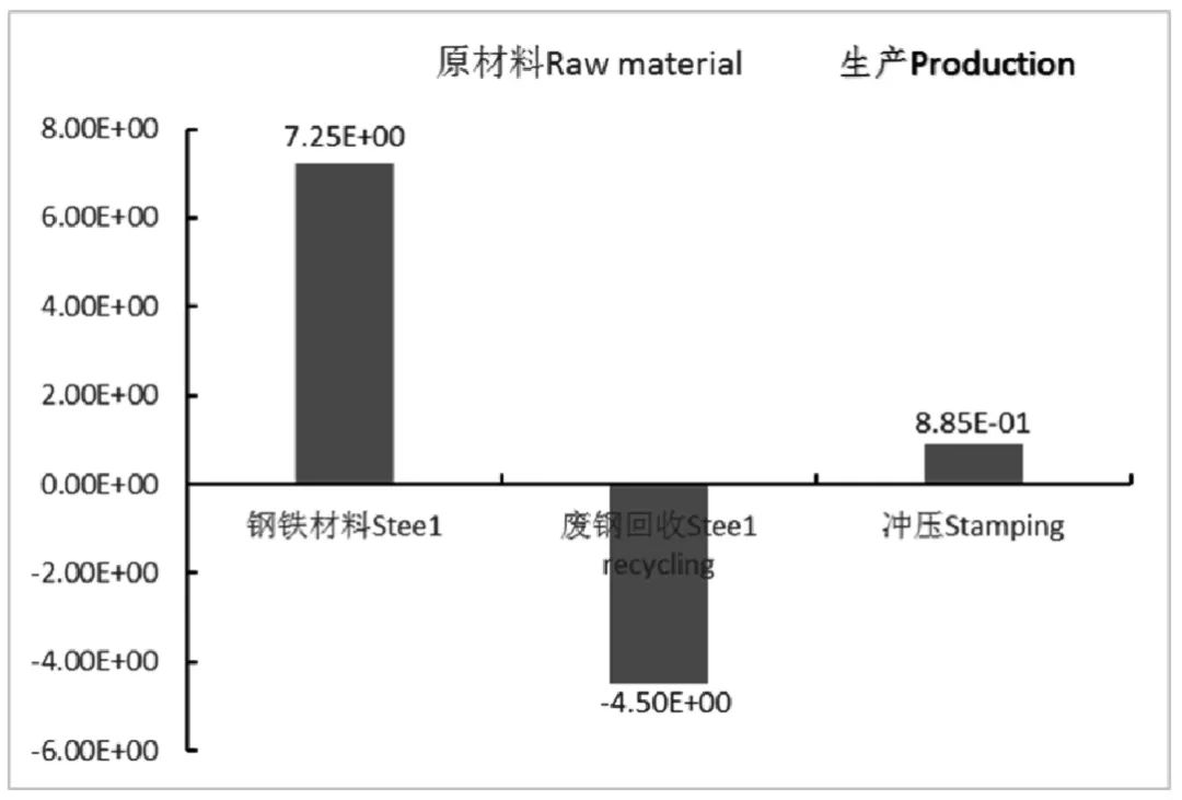 一个左前翼子板性命周期形成的环球增温潜势一共为3.64E+00kgCO2 e,性命周期各阶段的环球增温潜势如图4 所示。由图可知,原质料的获取阶段形成的GWP 最大,为2.75E+00kgCO2 e,进献了总量的75.5%;此中,钢铁质料分娩阶段进献了总量的199.2%;废钢铁质料的接纳欺骗削减了总量的123.6%。左前翼子板分娩阶段GWP 为8.85E-01kgCO2 e,占总量的24.3%。