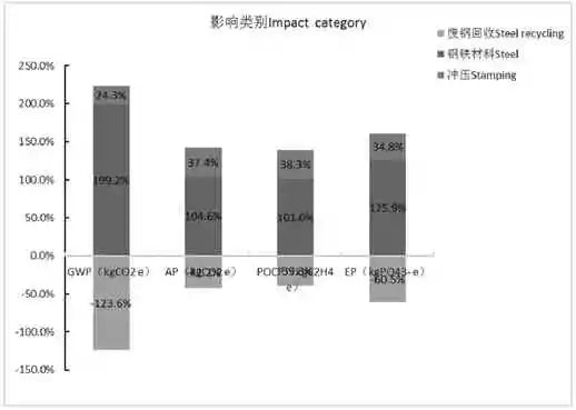 图8 呈现了左前翼子板性命周期各阶段境况影响百分比。正在GWP、AP、POCP 和EP 这四品种型的境况影响目标中,均是原质料的获取阶段的进献最大,占境况影响总量的62%~76%;此中,钢铁质料分娩阶段的进献最大,其占总量的百分比的101%~199%;对烧毁钢铁质料的接纳欺骗,相当于抵消了一面原质料获取阶段的境况影响,可能削减66%支配的境况影响。各品种型的境况影响中,左前翼子板分娩阶段的进献正在24%~38%。