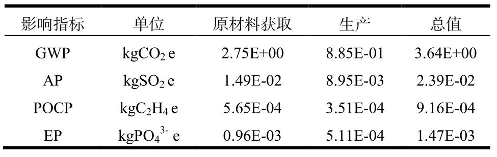 确定本次评判的宗旨和畛域,并正在清单解析和影响评判的根源上,获得了一个左前翼子板的环球增温潜势(GWP 100a)、酸化潜势(AP)、光化学氧化剂分娩潜势(POCP)、富养分化潜势(EP)和臭氧层损耗潜势(ODP)这5 个方面的目标值[4]。因为准备获得的ODP 的值很小,本研讨中核心协商前四个方面的境况影响,产物性命周期境况影响汇总情状如表4 所示。