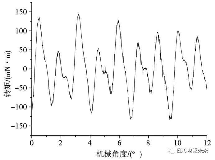此中:Tcog为齿槽转矩周期,LCM(z,2p)展现永磁电机极数与槽数的最小公倍数,其数值越大,齿槽转矩的周期越小,转矩幅值越小。图14为电机转子转过12度的齿槽转矩弧线。逛标电机因为其特地的定子齿槽构造,与老例永磁电机比拟,定子槽数添加一倍,若拔取适宜的电机极数,将增大该电机极槽配合的最小公倍数,对齿槽转矩有必定水平的强迫效率。