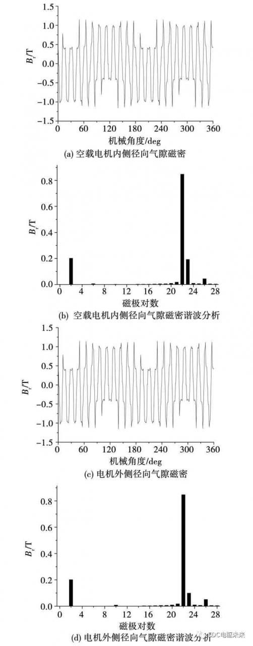 图11(a)、图11(b)为空载时电机内侧径向气隙磁密及其谐波领会,图11(c)、图11(d)为电机外侧径向气隙磁密及其谐波领会。从领会的结果可能看出,因为转子磁极为22对,正在表里侧气隙中均为22对极磁场最强,其他次磁场相对较弱。