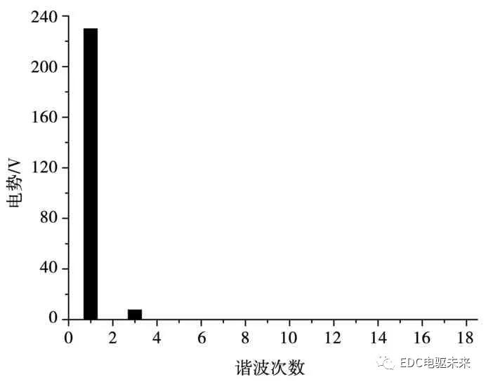 取A相一个周期举办谐波领会,结果如图13所示。此中,逛标电机的基波幅值为230 V,3次谐波幅值为7.7 V,其他次谐波基础为0。由谐波畸变率准备公式(5)可得空载反电势谐波畸变率为3.316%,反电势波形正弦度高,有利于电机安定运转。
