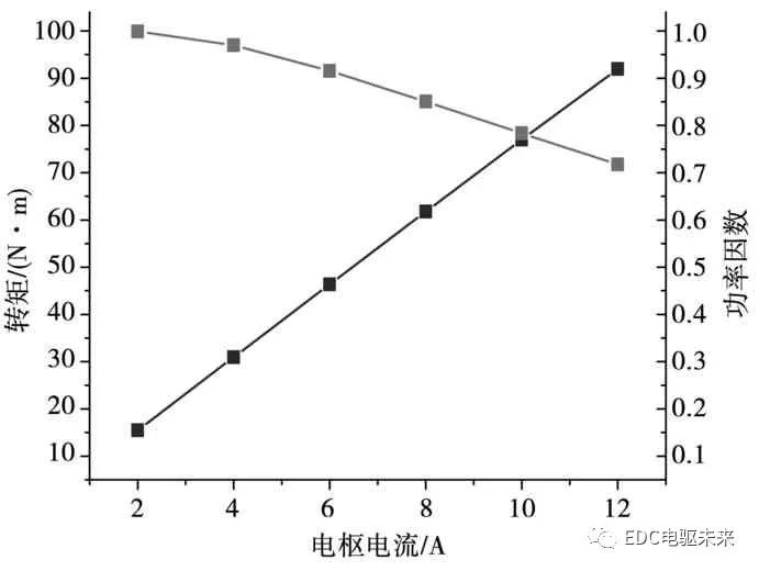 图15为该电机正在输入电流为2 A至12 A下所对应的的输出转矩及功率因数弧线。由图中可能看出,转矩随输入电流的增大而增大,功率因数则为低落趋向。