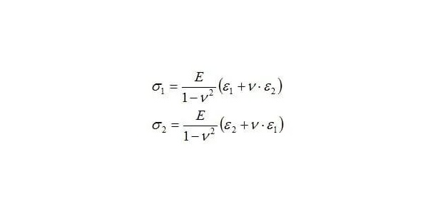 提防:正在应变丈量中,只可确定初始条目与稍后发生条目之间的分别。初始条目恐怕是无负载,但也恐怕是预加载条目,比如物体自身的重量,如一座桥。预加载或糟粕应力只可正在首肯的条目下举行,比如钻一个很小的孔。假如应力发作正在力功用对象(0°),也即是单轴应力形态,仅需依照上述胡克定律来准备资料应力σ。正在横向(90°),假使有可丈量的应变(横向屈曲,横向扩张),但不存正在资料应力。是以,为了得到牢靠的结果,务必明晰主应力对象,而且务必正在这个对象上丈量应变。假如这个对象是未知的或者只是近似的,则应当以双轴应力形态举行丈量和评估。正在试验应力明白的题目中,双轴应力形态操纵尤其屡次,不应当采用单轴应力形态的简陋措施来举行;不然将会导致宏大的差池。看待平面应力条目,极限法向应力 σ1 和 σ2 正在笔直对象1和2上。应力 σ1 和 σ2 被称为主应力,对象 1 和 2 为应力形态的主对象。假如主应力及其对象已知,则可昭着界说双轴应力条目。比如,已知主应力对象可存正在于有内压的圆柱状貌器的外貌上,或仅有挽回负载的轴上,弯曲的外貌等。看待分歧变量同时功用的功用,如法向力,弯曲,挽回等,主应力对象务必假定是未知的。双轴应力形态的主应力 σ1 和 σ2 的准备务必采用胡克定律的扩展版本,通过主应变 ε1 和 ε2,资料弹性模量 E 和资料泊松比 v 举行准备。l: