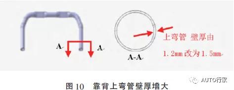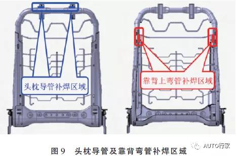 ·通过(A)正在头枕管套与靠背弯管处扩充焊点 (如图 9 所示),(B)扩充靠背弯管与座椅靠背边板之间的焊道数目 (如图 9 所示),(C) 靠背上弯管壁厚1.2mm 改为 1.5mm(如图 10 所示),(D) 扩充座椅靠背的刚性,减小碰撞经过中的变形,提升座椅靠背及头枕对假人的支持性, 减小座椅靠背及头枕的反弹对假人颈部摧残;