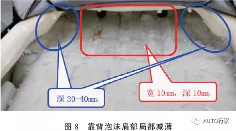 ·靠背泡沫肩部局限减薄 10-40mm(如图 8 所示),通过使假人肩部或许向后搬动,启发头部向后搬动,减小假人头后间隙;·通过消重坐垫泡棉硬度,增大坐垫变形,使头部质心向下搬动,扩充假人头枕高度,操纵假人头部质心位于头与头枕接触点所正在平面上;