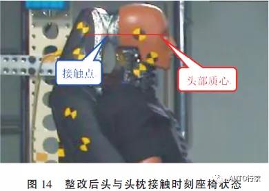 由表 5 鞭感动态打击试验结果可知, 整改后的座椅鞭打试验总分为 4.6 分,试验仅 NIC、上颈部 My 失分,且失分较少,到达了整改预期。(2)通过对图 12 试验弧线的解析可知, 通过操纵头后间隙、 调度靠背悬簧刚度可能成婚头部加快率与 T1 加快差值, 是进一步提升 NIC 得分的目标;(3)通过消重坐垫泡棉硬度,假人头部质心与头部接触点落正在统一水准面上,如图 14 所示,减小假人颈部受到的拉伸摧残, 消重假人头部向前转动的趋向;通过扩充焊道、扩充靠背上弯管厚度的格式, 扩充了靠背的刚度, 提升了靠背与头枕对假人的支持性,消重假人颈部受到的摧残。本次试验假人颈部Z 向摧残获得满分,上颈部 My 摧残获得消重,如图13 所示。