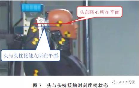 本次试验中, 通过解析试验录像可知, 因为头后间隙较大,加之假人身体挤压座椅靠背及头枕向后挽救, 假人头与头枕刚接触时, 头与头枕接触点所正在水准面正在头部质心所正在水准面之下(如图 7所示),运动前期头枕向上拖着头部,假人颈部受到拉伸, 头绕头部质心向前转动, 之后头枕强迫假人头部上窜,假人下颚接收,扩充了上颈部 My 与颈部 Z 向摧残。