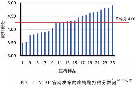 2018 年版《C-NCAP 解决法例》执行已有一段期间, 截止 2019 年 7 月 3 日,C-NCAP 官方共计揭橥四批共计 30 款车型的座椅鞭打试验功效[5]。因为汽车主机厂对待试验车型的商场定位差别, 本文仅以取得四星及以上的 25 款车型座椅鞭打功效举行座椅鞭打功能近况举行商酌。25 款座椅鞭打功效均匀分为 4.26 分,较 5 分的满分功效另有很大的擢升空间。同时最高得分 4.90 分与最低得分 3.50 分之间相差 1.4 分, 这也再现出商场上座椅鞭打功能的乱七八糟。