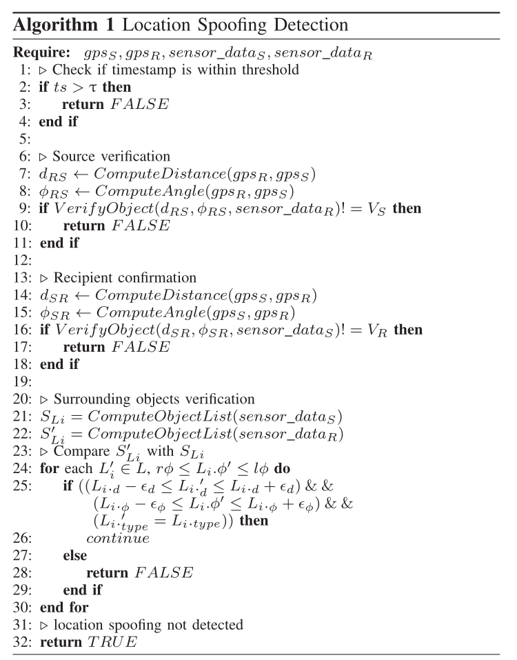 正在验证了源 VS 和接管器 VR 的身分之后,VR 不绝验证 VS 的边际对象, 由于 VS 的 ADAS 传感器体例缉捕的 VS 的边际对象也该当被 VR 的 ADAS 传感器体例缉捕。请预防,咱们假设时钟是同步的,而且它们都操纵传感器数据sensor_dataS和同时天生的传感器数据sensor_dataR。为了验证 VS 的边际对象,VR 天生两个对象列表: 操纵传感器数据sensor_dataS天生的列表 SLi 和操纵传感器数据sensor_dataR天生的列表 S′Li。对象列表包蕴 隔断、角度和对象类型等新闻,对象按对 VS 隔断次第排序。现正在 VR 对比 SLi 与 S′Li 的隔断、角度和对象类型,检讨对象类型是否成亲,统一对象的 隔断和角度是否正在差错局限内(ϵd 和 ϵϕ)。第 20-30 行解说了边际物体验证的进程。请预防,它将只检讨选定的近来的对象,由于 VR 不妨无法通过其传感器检测 VS 的一切境遇。正在这种环境下,可能操纵犹如性评分技能。正在验证了边际的对象之后,算法终止,没有检测到身分利用。