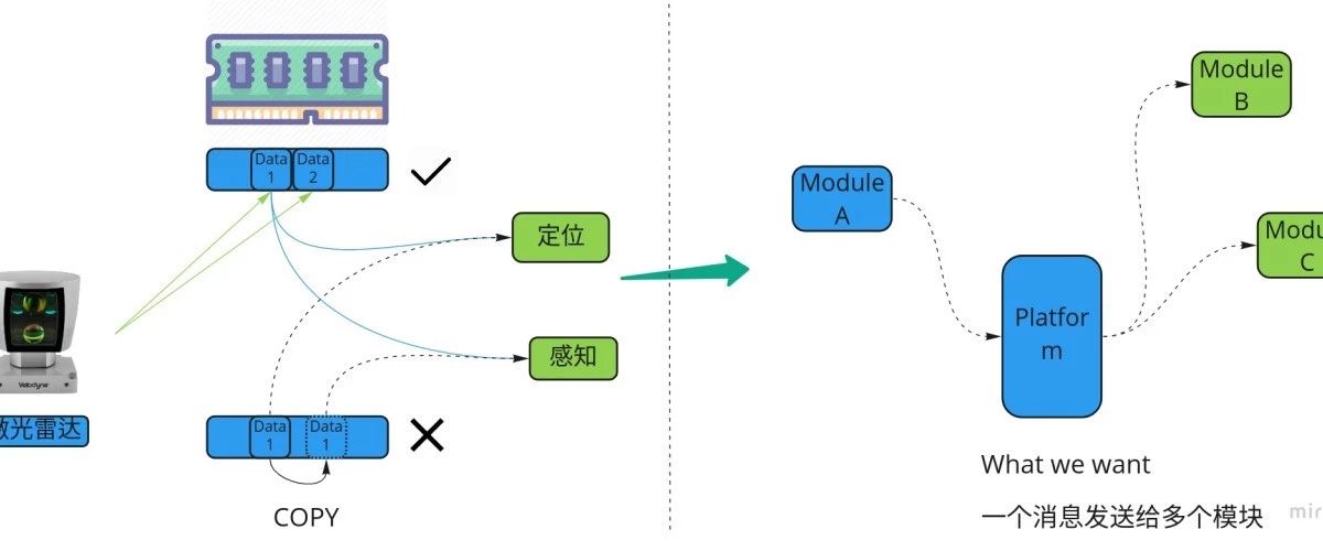 下面咱们看下各个模块是怎么劳动的,咱们以激光雷达来举例子,激光雷达及时的拍摄了一帧数据,然后放到了编制内存,这期间感知和定位模块都须要执掌激光雷达的数据,一个欠好的形式的是把数据拷贝一份分袂给感知和定位模块,由于大数据的拷贝很耗年光,影响编制机能。咱们须要换一种形式,以转达内存地方的形式把数据给感知和定位模块,节减内存的拷贝,分享的教练也夸大了这点。接下来咱们把方才的经过概括一下,即来了一份激光雷达的数据之后,编制分袂挪用定位和感知的函数,而且把数据正在内存中的地方行动参数转达进去。接着咱们把模块概括一下,咱们有3个模块,编制平台须要把 A 模块的数据转达给 B 和 C 模块,如许一来,咱们须要的是一个或许同时发送音信给众个模块的功用,即一个漫衍式的音信队伍。