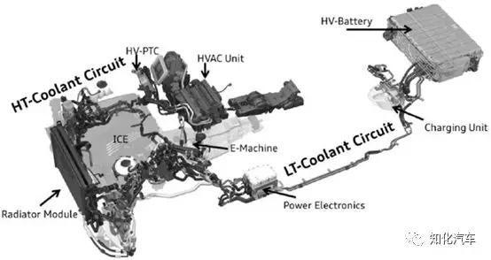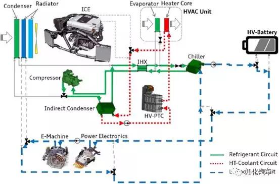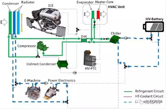奥迪Q7的整车热经管架构如下图所示,重要蕴涵制冷剂回道、高温(HT)冷却回道(重要用于冷却策动机)、低温(LT)冷却回道(重要用于冷却动力总成和电池)。须要加热、冷却的对象重要是:电池、策动机、乘员舱、电机及合连的功率器件等。