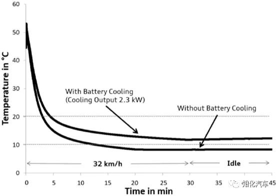测试的结果如下图,图示温度为仪表板透风口的均匀气氛温度,能够看出,电池冷却减缓了乘员舱温度降低的速率,电池冷却占用的功率约为2.3 kW。