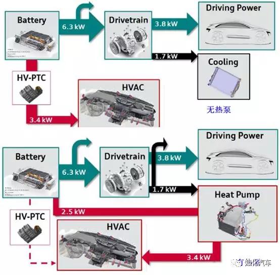 进一步来说明正在加热形式下,奥迪Q7 e-tron有无热泵的能量流情状。除了热泵外,插足加热的编制蕴涵PTC加热器、制冷剂回道、散热器和HVAC。