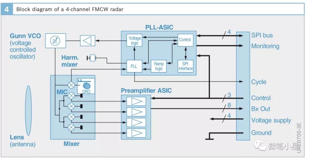 范例雷达传感器编制构成席卷无线电发射掌管所需的锁相环掌管芯片PLL ASIC和压控振荡器VCO。调制后的无线电信号经天线和镜头发射后,回波信号由四个定向天线给与。通过给与微波芯片MIC构成的混频器MIXER,将频率差信号经预放大器芯片Preamplifier ASIC放大后实行信号管束。